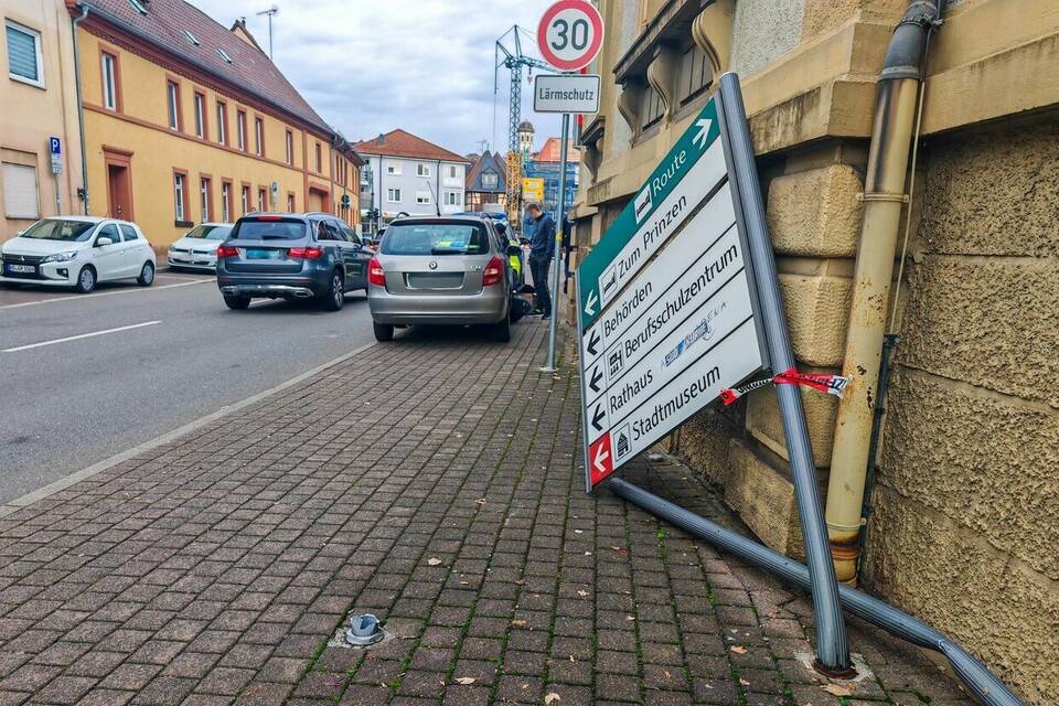 Der Skoda geriet aus noch unbekannter Ursache auf den Gehweg, nietete einen Absperrpfosten aus Stahl um, bevor er gegen ein städtisches Hinweisschild am Sparkassen-Gebäude prallte.