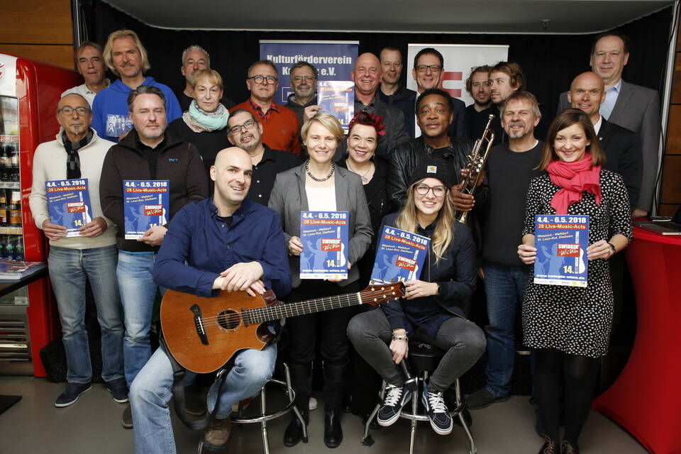 Musiker, Rathaus-Chefs und Organisatoren hatten sich gestern auf der Bühne des "Harry’s" versammelt, um für das bevorstehende Musikfestival "Swingin’ WiWa" die Werbetrommel zu rühren. Foto: Pfeifer