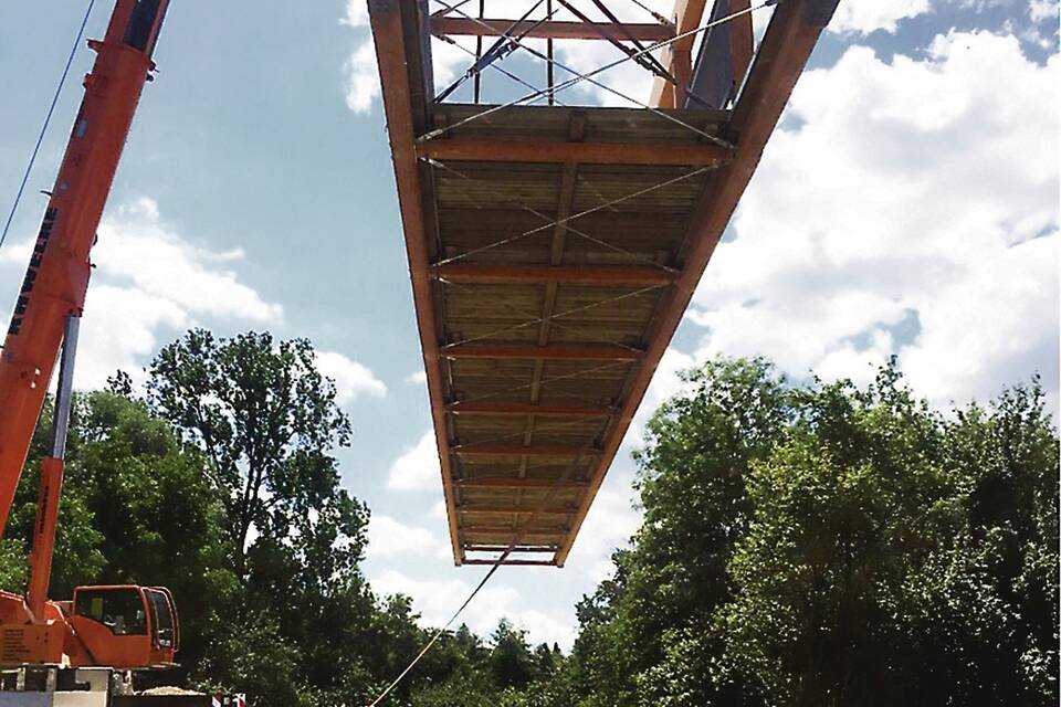 Und runter damit: Gegen 13.30 Uhr wurde die 28 Meter lange Holzbrücke per Kran in der Wiesenbacher Straße abgeladen. Fotos: privat/Alex