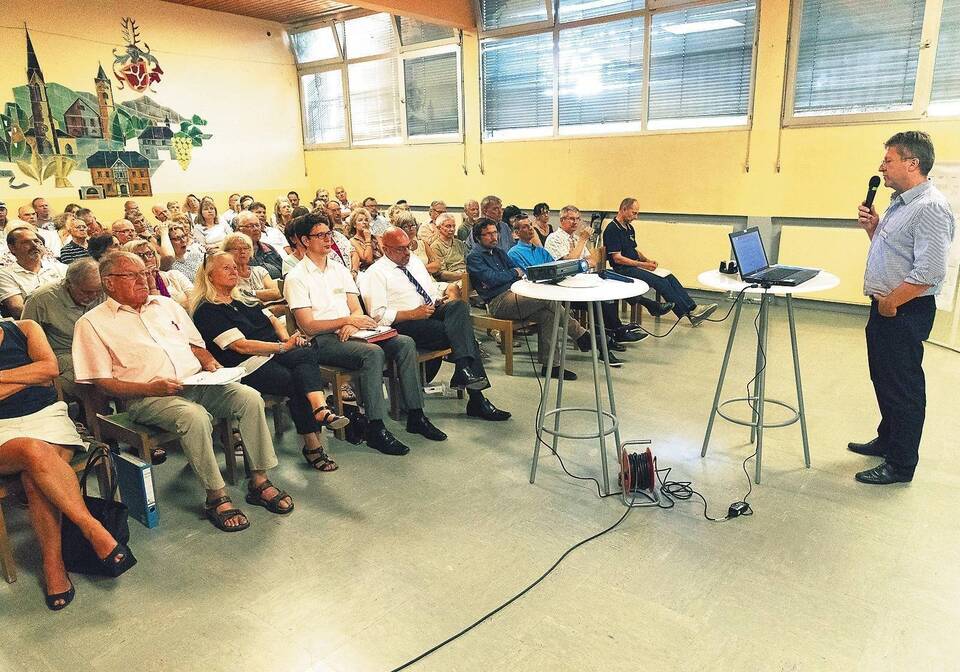 Informationsveranstaltung zur Anschlussunterbringung vor knapp zwei Wochen: Der Leiter des Bürger- und Ordnungsamtes, Markus Böhm, informierte die rund 100 Zuhörer. Foto: Kreutzer