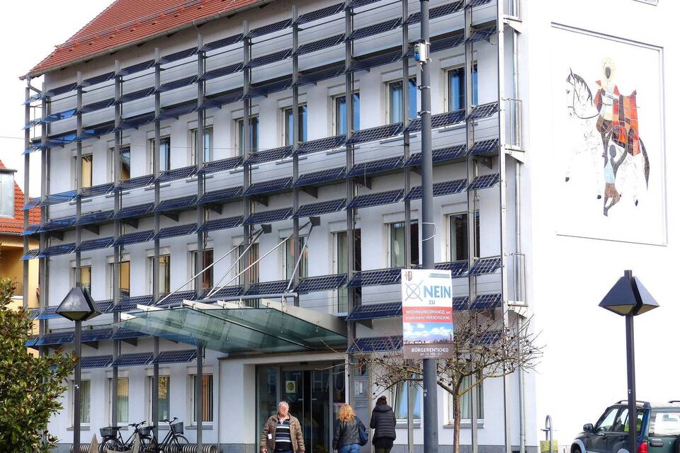 Ein Stein des Anstoßes für die Bürgerinitiative sind die Plakate, die die Verwaltung vor dem Rathaus aufhängen ließ. Das Kommunalrechtsamt hat damit aber kein Problem und entkräftigt weitere Vorwürfe gegen Bürgermeister Simon Michler. Foto: sti