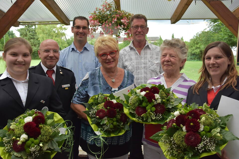 DRK-Ortsvereinschef Hans-Peter Ries (2. v. l.) ehrte langjährige Mitglieder: Dominique Ullmann, Ruth Birkhof, Gertrud Stock und Simone Stein (v.l.). Mit Jens Reinemuth und Peter Buxkämper (hinten v. l.) fanden sich gleich zwei neue stellvertretende Vorsitzende. Foto: Pilz