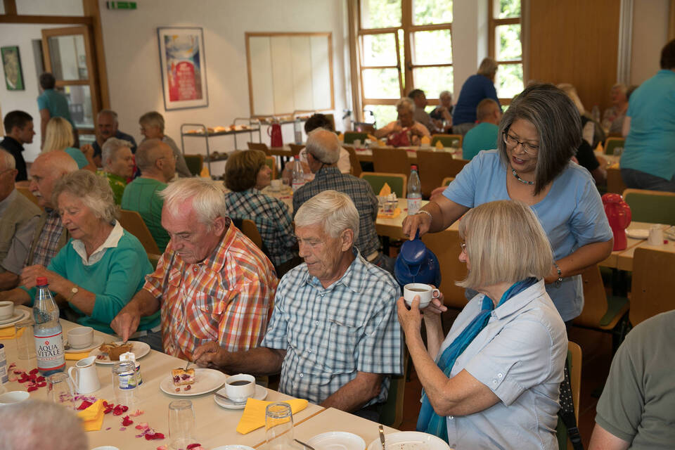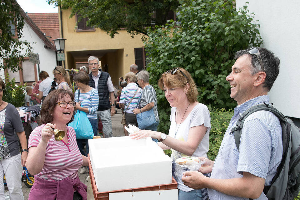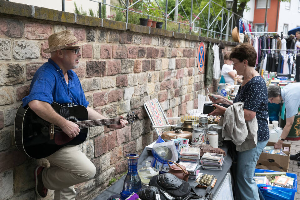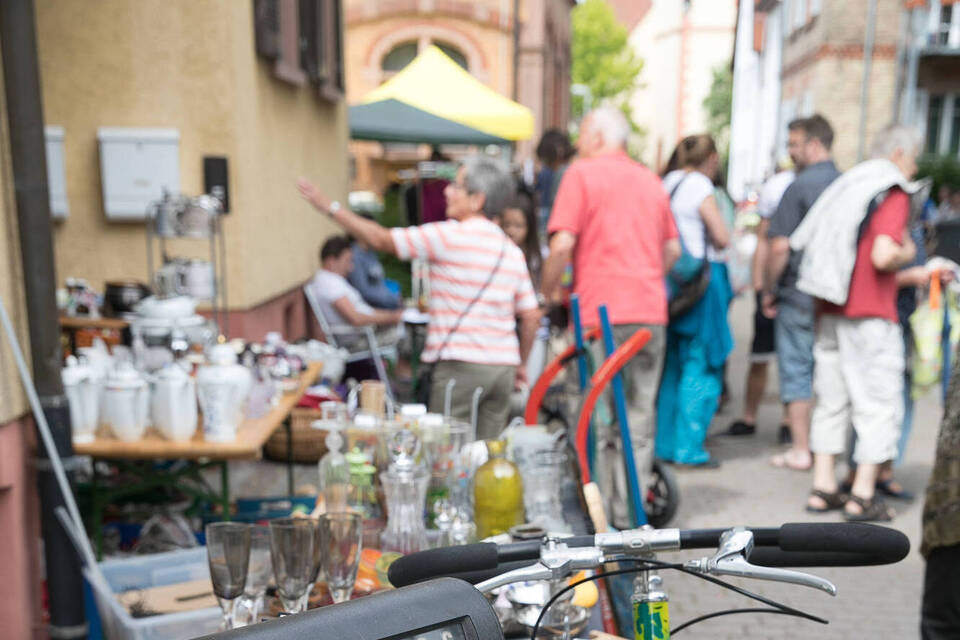Alles, was rausmuss aus Kellern und Schränken, wird auf Campingtischen, an Kleiderstangen, in Koffern und auf Picknick-Decken angeboten. Sogar der eine oder andere bislang verschlossene Vorhof hat sein Tor geöffnet. Hier legt man sich verkaufstüchtig ins Zeug und bietet obendrein noch selbst gemachten Eistee zur Erfrischung an. Ein paar Schritte abseits des geschäftigen Treibens lädt der "offene Garten" von Hermann Stöhrer zum Verweilen ein. Hier blühen Ziersalbei, Rosen und Hortensien in atemberaubendem Blau und Pink. Nebenan im Hofcafé des MGV ruft eine fröhliche Stimme: "Möchten Sie Limonade probieren?" An den Tischen sitzen die ersten Mittagsgäste und lassen es sich gut gehen bei Kaffee und Kuchen, alternativ schmeckt eine knackige Bratwurst mit Brot. Kleine Snacks sind auch mobil zu haben im "Rollenden Frühstückswägelchen" des MGV, das sich mit einem Klingeln seinen Weg durch die Gassen bahnt.
