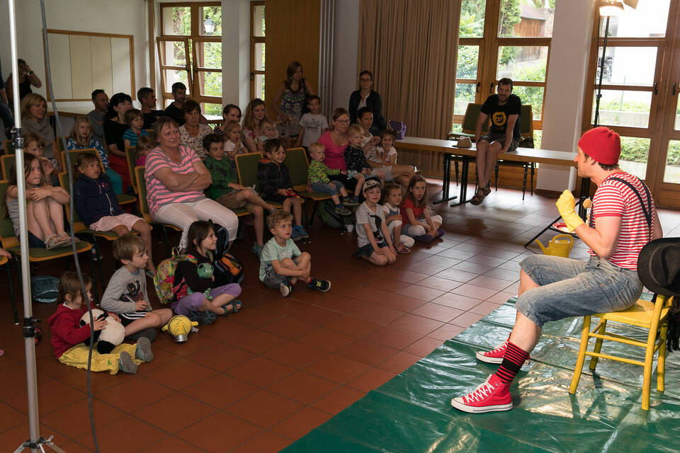 Die kleinen Flohmarktgäste machen sich derweil auf den Weg zum Evangelischen Gemeindehaus. Dort spielt für sie auf Einladung der Landfrauen das Kindertheater "Theaterta" das Stück "Hans im Glück". Mehr als eine rote Mütze, ein paar Gummihandschuhe und eine Spülbürste braucht Schauspieler Roman Moebus alias "Hans" nicht, um die kleinen Zuschauer nach Amerika zu entführen. Dort arbeitet Hans seit sieben Jahren als Tellerwäscher. Aber das ist jetzt sein letzter Teller, denn Hans ist mittlerweile Millionär. Ob ihn das wohl glücklich macht? Grimms Märchen einmal neu erzählt.