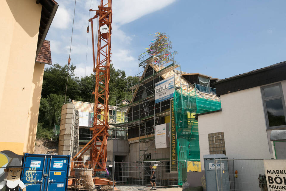 "Wir sind sauber aus dem Dreck gekommen", sagte Schäfer in Bezug auf die Rohbau-Arbeiten. Inzwischen sind auch das eigentliche Erdgeschoss aus Holz und das Dach errichtet, im vorderen Trakt müssen dort noch die Gauben eingesetzt werden. Die beiden Gebäudeteile werden durch einen Zwischenbau verbunden, in dem auch der Aufzugschacht für den barrierefreien Zugang der beiden unteren Geschosse Platz finden wird.