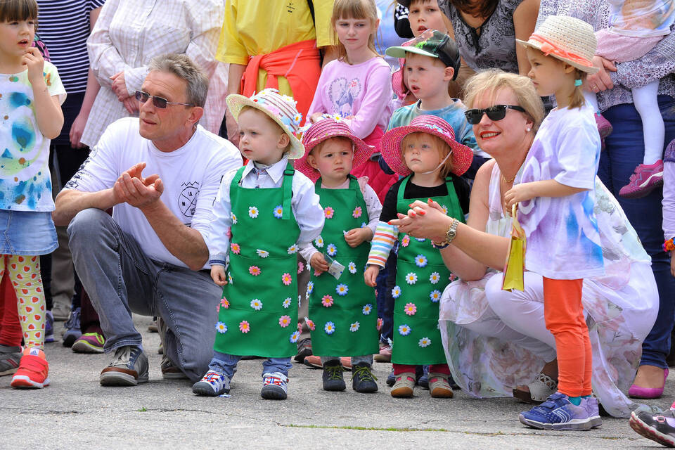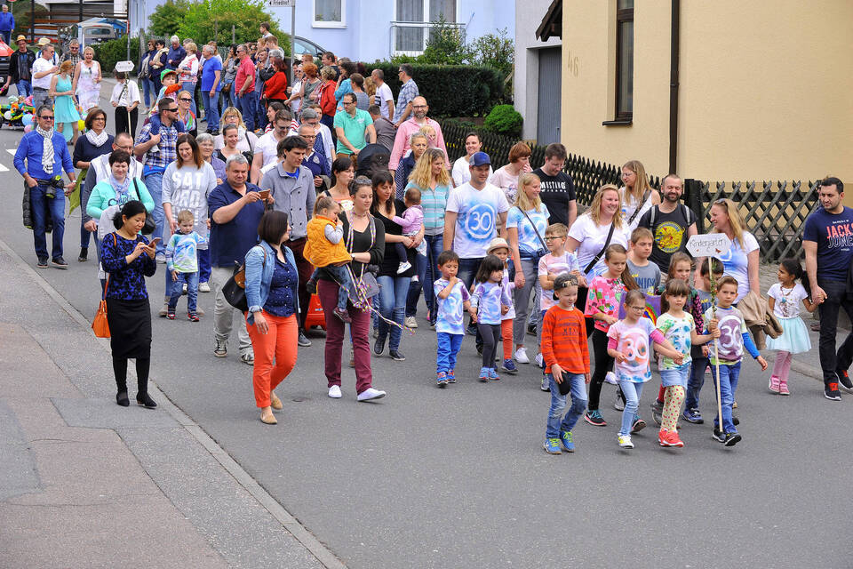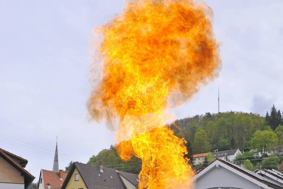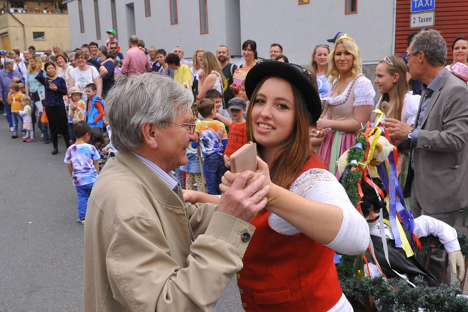 Doch Ortsvorsteher Kraus legte lieber mit Tanzpartnerin Selina Leibinger einen langsamen Walzer auf den Asphalt. Kerwe-Pfarrerin Kress wirbelte anschließend mit Max über die Fläche und wurde dann von der Borschtin abgelöst. Nicht nur diese Darbietung war herzallerbliebst, auch die kleinen Gärtner der Krabbelgruppe entzückten das Publikum entlang der Straße mit ihren Kostümen. Mit geblümten grünen Schürzchen, passenden Hüten und der Gießkanne in der Hand, marschierten sie tapfer in Richtung evangelische Kirche. Am Ende der Treppenstufen zum Gotteshaus wartete nämlich schon die nächste Sensation: ein professioneller Feuerakrobat.