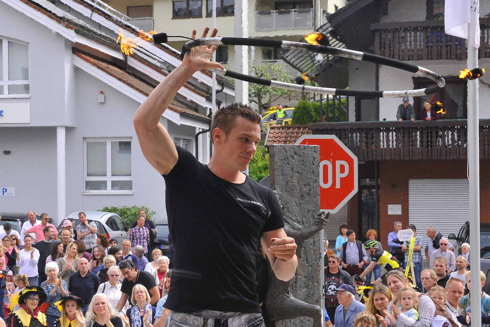 Mit Leichtigkeit balancierte Jeremy einen brennenden Stuhl über dem Kopf und ließ die Flammen einer lodernden Fackel über seine Haut tanzen. Damit beeindruckte der muskulöse Feuersschlucker nicht nur das weibliche Publikum. Nach einer kurzen Verschnaufpause fanden sich die Gäste dann im Schulhof ein, wo die unverzichtbare Kerwepredigt auf dem Programm stand. Traditionell im Dialekt verfasst, schallten die knackigen Reime der Pfarrerin über den Platz. Die mangelhaften "Fluchttüren und Trebbe" vom Zehntkeller, der nicht vorhandene Sparkassen-Geldautomat und stinkende Hundehaufen waren ein Teil der Rede. Von Ann-Christin Kress’ anfänglicher Nervosität war nichts mehr zu spüren.