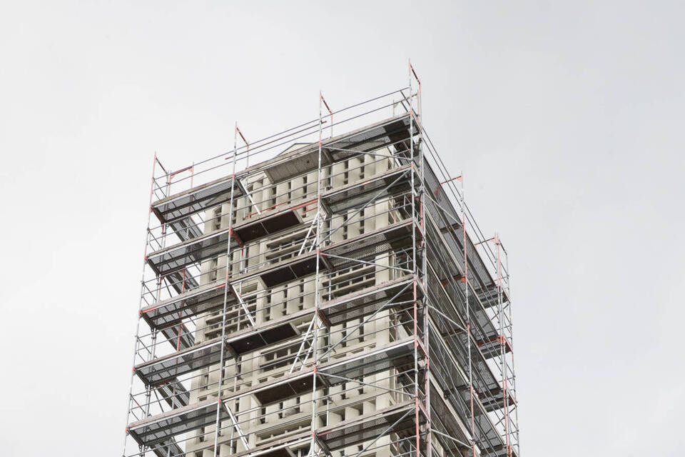 Brüchiges Material: Seit fünf Jahren ist der 38 Meter hohe Turm von einem Gerüst mit Schutznetz umgeben