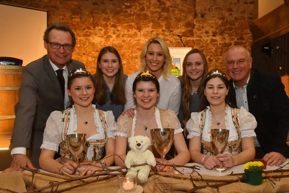 Vor dem Vesper steht der protokollarische Höhepunkt des Abends, eingeleitet durch eine weitere Jagdhorn-Fanfare: Zu stehenden Ovationen ziehen die neuen Weinhoheiten in den Keller ein. Vorgestellt werden die designierte Weinkönigin Lisa Menges und ihre Prinzessinnen Annalena Spieß und Sophie Koch von WG-Vorstandschef Friedrich Ewald. "Wir wissen das Amt in guten Händen", sagt er, froh, "wieder drei junge, hübsche und interessierte Schriesheimer Mädels" gefunden zu haben. Wie immer kenntnisreich geht er auf die jeweiligen Familienverhältnisse und die Beziehungen zum Weinbau ein, dann reicht er das Mikro an Lisa Menges weiter.