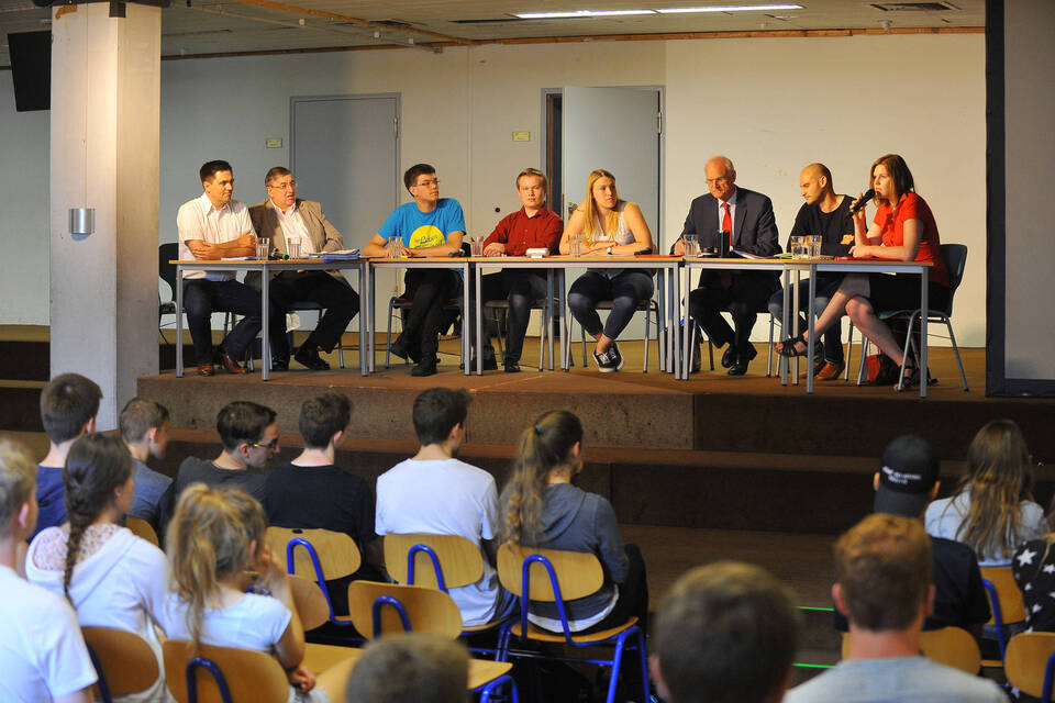 Drei Themen hatte ihr Kurs zuvor gemeinsam vorbereitet: Terror und Sicherheit, Rente und internationale Beziehungen. Zu jedem der drei Blöcke hatten die Gymnasiasten, ähnlich wie bei Talkshows im Fernsehen, einen Einspieler vorbereitet. AfD-Kandidat Kaufmann forderte eine bessere Sicherung der Außengrenzen und die konsequente Abschiebung von Gefährdern, aber auch eine bessere Ausstattung der Polizei, zum Beispiel mit "Bodycams". Dem entgegnete CDU-Abgeordneter Karl A. Lamers: "Was Herr Kaufmann da sagt, ist nicht allein AfD-Programm." Auch die "Bodycams" habe dessen Partei nicht erfunden, und es sei die Union gewesen, die eine Vorratsdatenspeicherung über vier Wochen möglich gemacht habe.