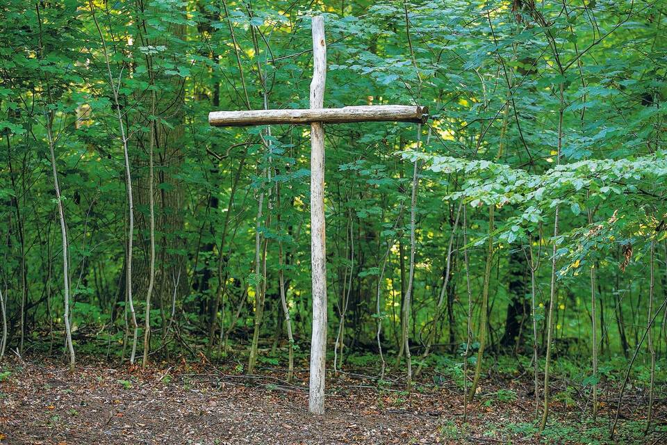 Ein einfaches Holzkreuz steht am Andachtsplatz mit Platz für rund 50 Menschen im "FriedWald" in der Nähe von Grevesmühlen in Mecklenburg-Vorpommern. Foto: dpa