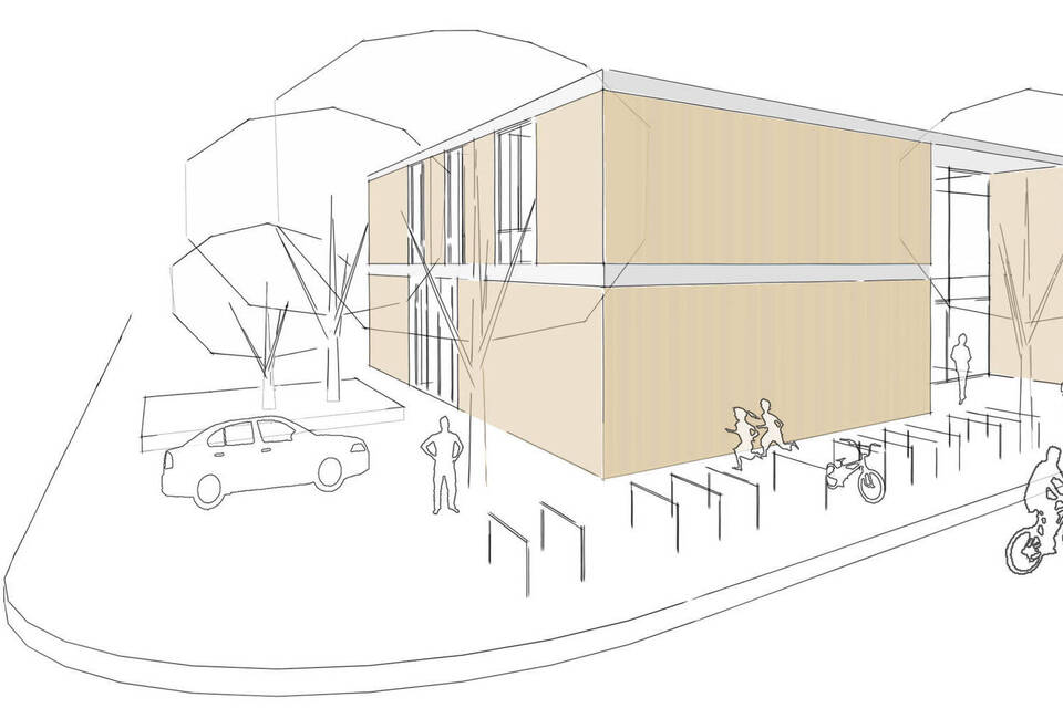 So soll der Neubau des Kindergartens in der Kurpfalzstraße - dessen Planung am Dienstag im Gemeinderat eine weitere Hürde nahm - von außen aussehen. Grafik: Klinkott Architekten