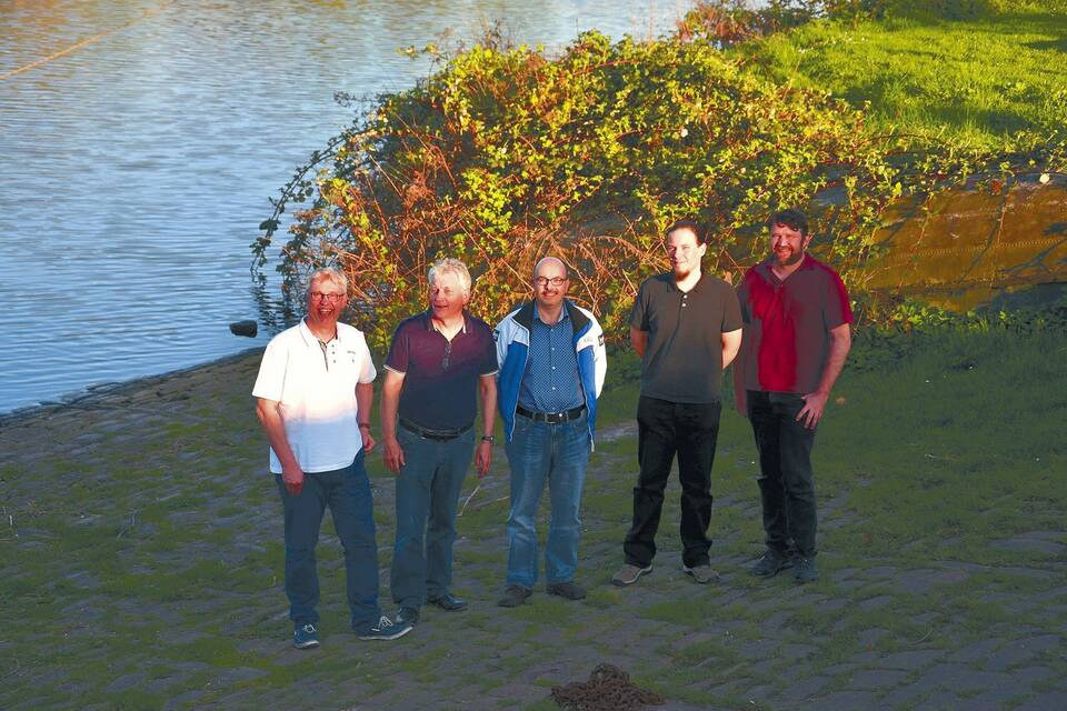 Im Neckar bei Edingen-Neckarhausen befindet sich das TFA, gegen das die SPD nun vorgehen will. Im Bild: Thomas Zachler, Eberhard Wolff, Arno Kaiser (Geschäftsführer Wassergewinnungsverband), Patrick Hennrich und Michael Bangert (v.l.). Foto: Pilz