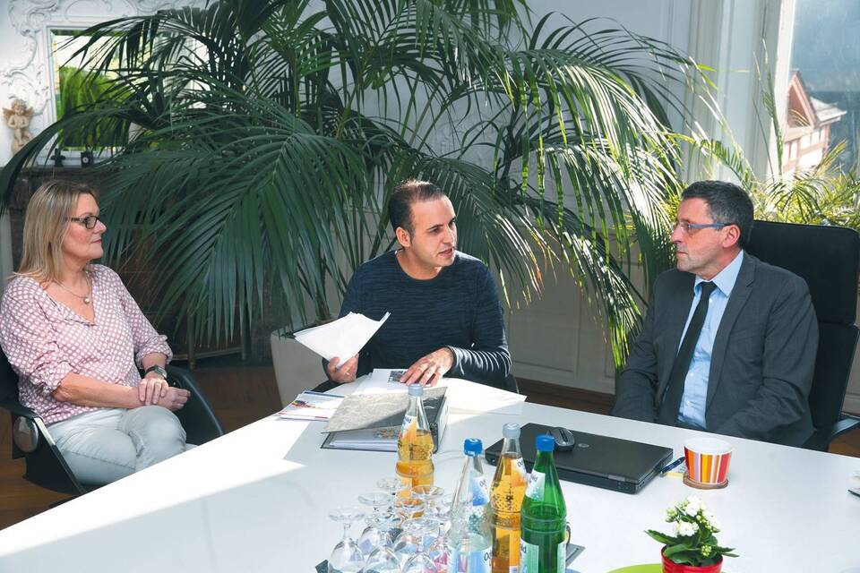 Miguel Silva (m.) und weitere Vertreter der Bürgerinitiative "PROKINDERSpielplatz Klausingstraße" übergaben Bürgermeister Torsten Fetzner einen dicken Ordner voll Unterschriften für den Erhalt des Spielareals. Foto: Kreutzer