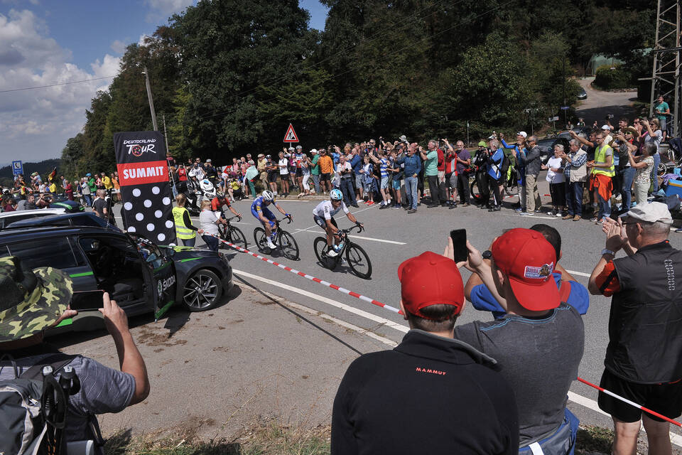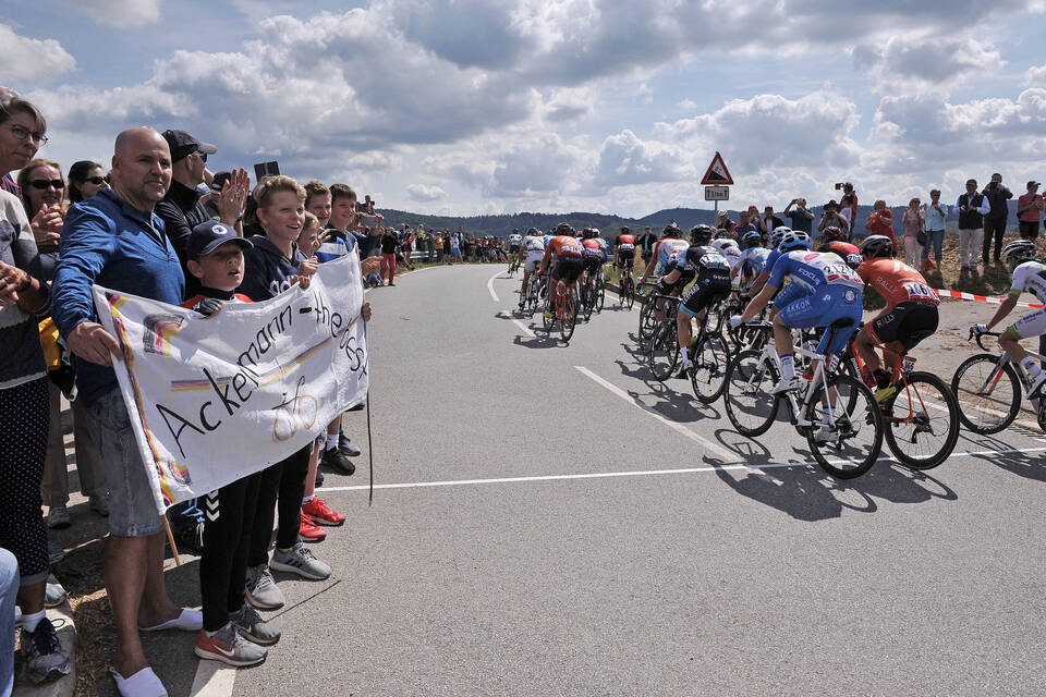 Die Stimmung ist dennoch prächtig: Die Zuschauer winken dem Hubschrauber und den Begleitfahrzeugen zu, werden auch von den Polizisten freundlich zurückgegrüßt. Um 12.41 Uhr zieht die Spitzengruppe vorbei, von den Zuschauern lautstark angefeuert. Gut fünf Minuten später folgt das Hauptfeld - mit Pascal Ackermann im Trikot des Deutschen Meisters.