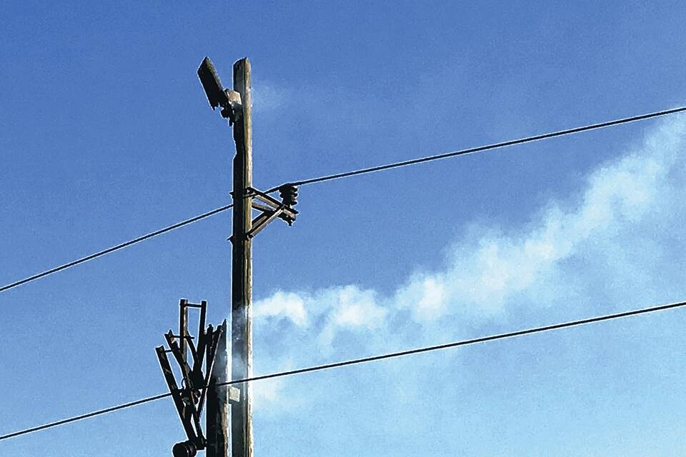 Erst nach dem Abschalten der Leitung konnte die Feuerwehr den brennenden Isolator am Strommast löschen. Foto: Wieder
