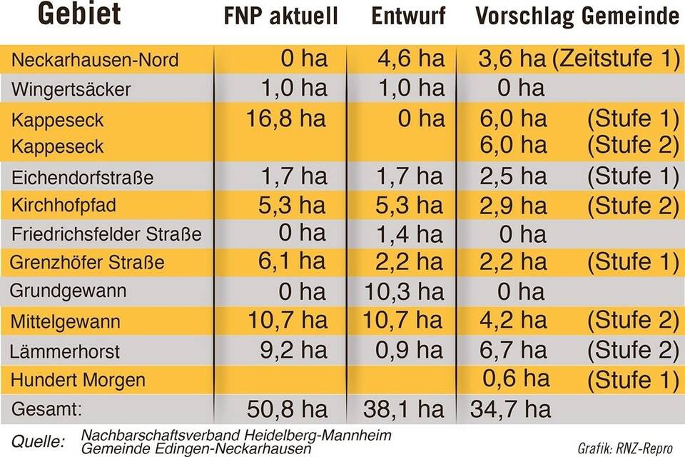Der Vorschlag der Verwaltung enthält Zugeständnisse an die Bürger, die sich zum Vorentwurf des FNP des Nachbarschaftsverbands Heidelberg-Mannheim geäußert haben. Das Grundgewann mit seinen 10,3 Hektar ist raus; das Mittelgewann wurde von 10,7 auf 4,2 Hektar verringert und von Zeitstufe 1 auf Stufe 2 angehoben. Sollte hier irgendwann einmal wieder eine Bebauung diskutiert werden, wäre diese also erst in etwa fünf Jahren möglich.