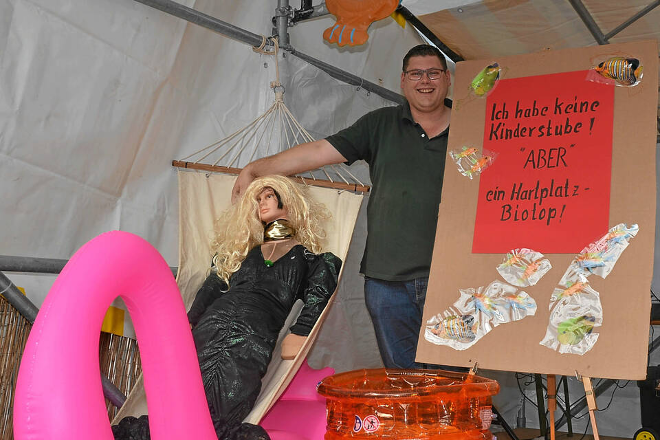 "Ich hab’ keine Kinderstube, aber ein Hartplatzbiotop" - den Satz hat Tobias Hertel der Kerweschlumbel in den Mund gelegt. Sprechen kann sie ja nicht, nur blond sein und gut aussehen. Sie erfreut ihre Betrachter in einem schuppig-grün schimmernden Kleid. Ein aufgeblasener rosa Flamingo und eine Hängematte gehören zu ihren Requisiten. Ihre stumme Botschaft: Die "Fischkinderstube" ist noch nicht fertig, und die Fußballer hätten gern einen Kunstrasenplatz.