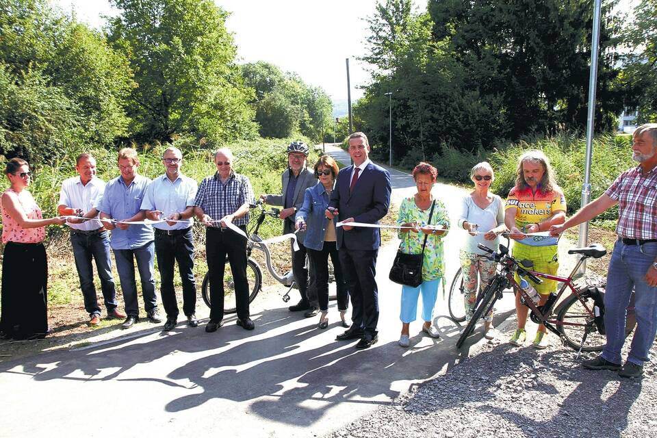 Mit dem symbolischen Durchtrennen des Bandes gaben OB Reinwald (Mitte), Gemeinderäte und Verwaltungsmitarbeiter den ausgebauten Radweg frei. Foto: Hebelmann