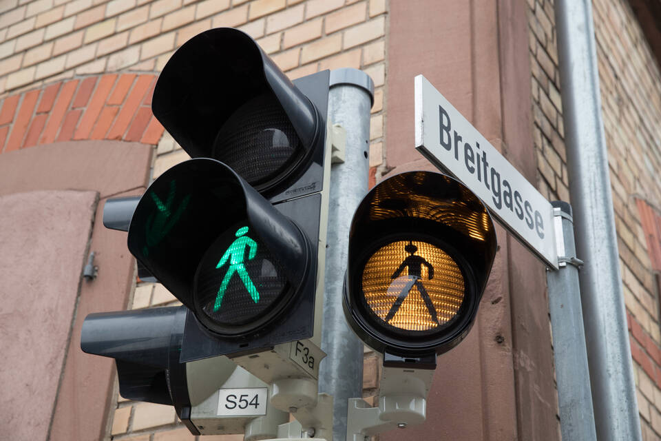 Etwas komplizierter ist es am Fußgängerübergang Breitgasse. Hier dürfen die Fußgänger die Straße bereits überqueren, während die Fahrzeuge auf der B3 noch vor einer roten Ampel stehen. Die springt jedoch auf Grün, während die Fußgängerampel ebenfalls noch Grün leuchtet. Auch hier müssen also die Abbieger in die Breitgasse auf die Fußgänger achten. Mit einem schnellen Schritt schaffen es Fußgänger allerdings, die Breitgasse zu überqueren, während die Autos noch nicht fahren dürfen.