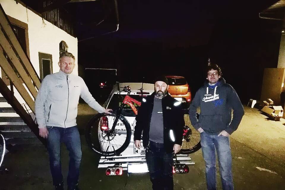 Markus Kunkel (links) und Christian Lang (rechts, beide "Rad Sport Bergstraße") bei der Radübergabe an Bernd Kohl. Foto: P