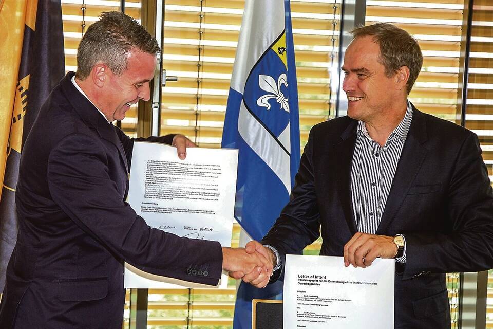 Weit und breit ist ein derartiges Projekt nicht zu finden: ein interkommunales Gewerbegebiet mit einer Fläche von 70 Hektar. Just einen solchen grenzüberschreitenden Industriepark wollen die Nachbarstädte Leimen und Heidelberg in den nächsten Jahren auf den Weg bringen. Einen entsprechenden "Letter of Intent", sprich: eine Erklärung, unterzeichneten die Oberbürgermeister Hans D. Reinwald und Eckart Würzner gestern feierlich im Leimener Rathaus. Das gemeinsame Leuchtturmprojekt soll zum einen die verkehrstechnische Erschließung des Heidelberger Gewerbegebiets Rohrbach-Süd verbessern, zum anderen sollen Flächen im Leimener Norden einer Gewerbenutzung zugeführt werden. (fre)