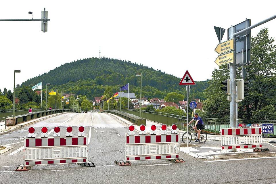 Abgeriegelt: Die Friedensbrücke in Neckargemünd wird Anfang Juli für drei Monate voll gesperrt. In der Folge kommt es im Berufsverkehr zu kilometerlangen Staus. Foto: Alex
