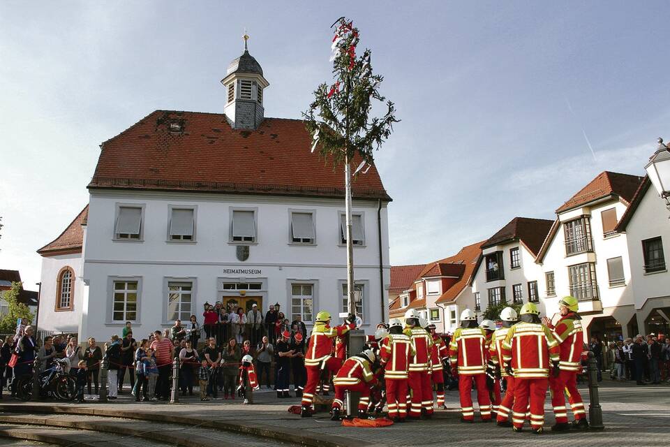 Gekürzt: Sandhausen hat in diesem Jahr nur ein "Maibäumchen". Risse im Holz ließen ein Aufstellen des stattlichen 20-Meter-Stamms nicht zu. Der Ersatz ist gerade einmal acht Meter "hoch".