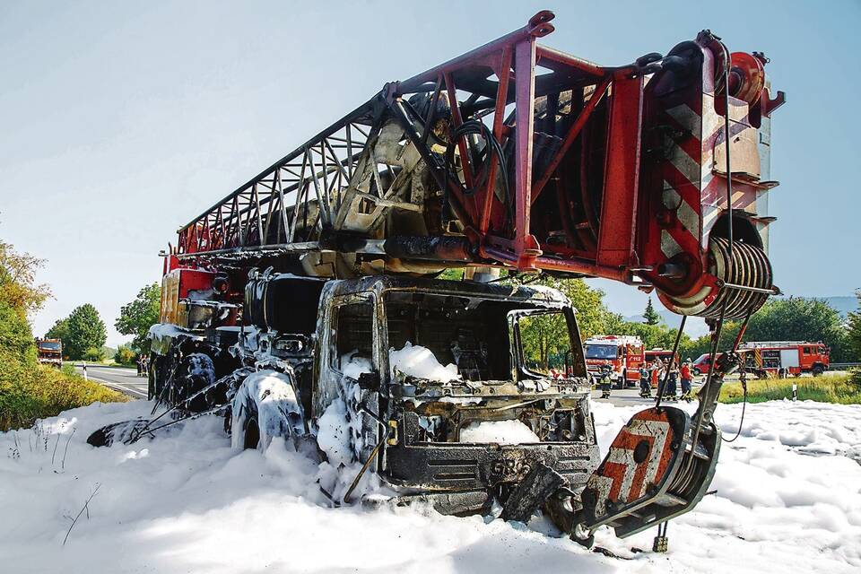 Umgestürzt: Beim Abladen von Erde kippt ein Laster im Schönauer Wald um und fällt eine Böschung hinunter. Der Fahrer wird leicht verletzt, zwei Kräne sind für die Bergung notwendig.