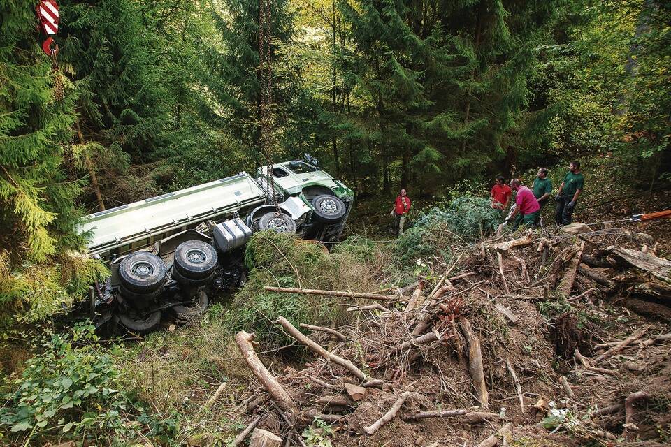 Umgekippt: Im Schönauer Wald stürzt ein Lastwagen einen Hang hinunter. Foto: Alex