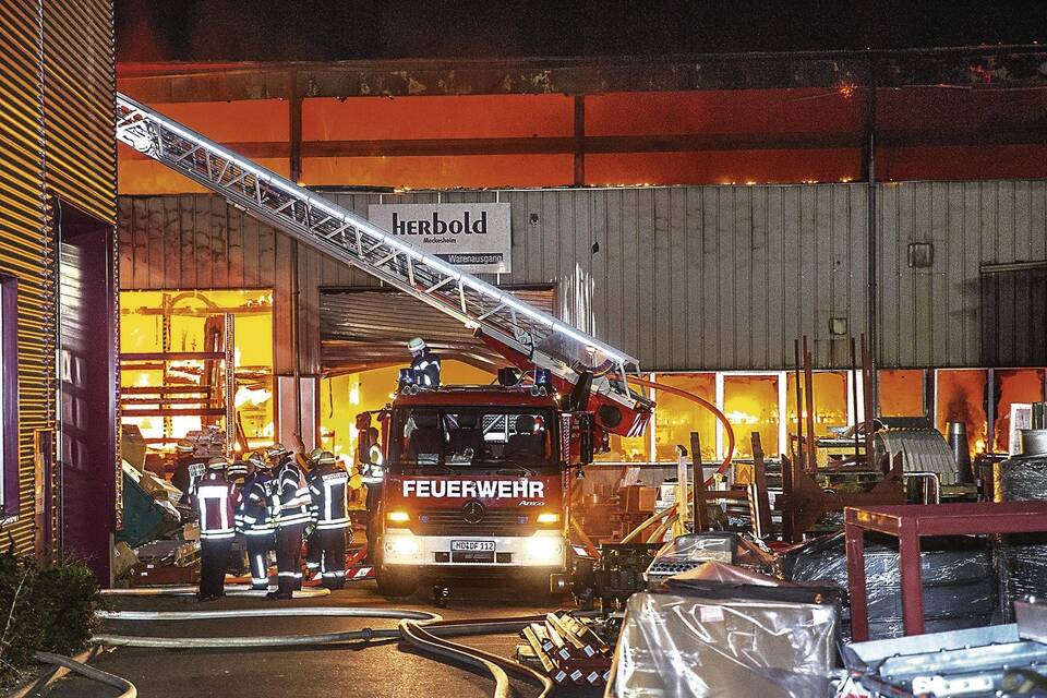 Gebrannt: Bei einem Großbrand auf dem Gelände der Firma Herbold in Meckesheim entsteht ein Millionenschaden. 226 Feuerwehrleute sind im Einsatz, die Löscharbeiten dauern stundenlang.