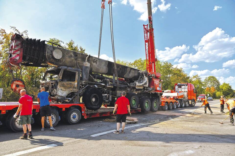 Mit zwei weiteren Kränen wurde der abgebrannte 60-Tonnen-Kran auf einen Tieflader gehievt. Foto: Priebe