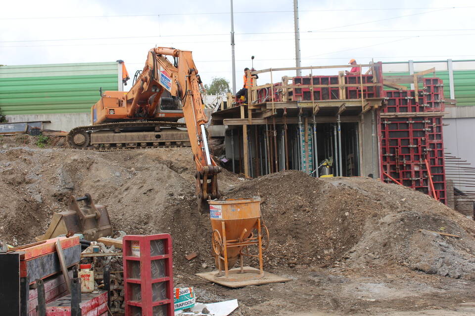 Die Arbeiten am Ladenburger Bahnhof für den Bau des Aufzugsschachtes sind im vollen Gange. Im Januar soll der S-Bahn-taugliche Bahnhof fertig sein. Foto: Sturm