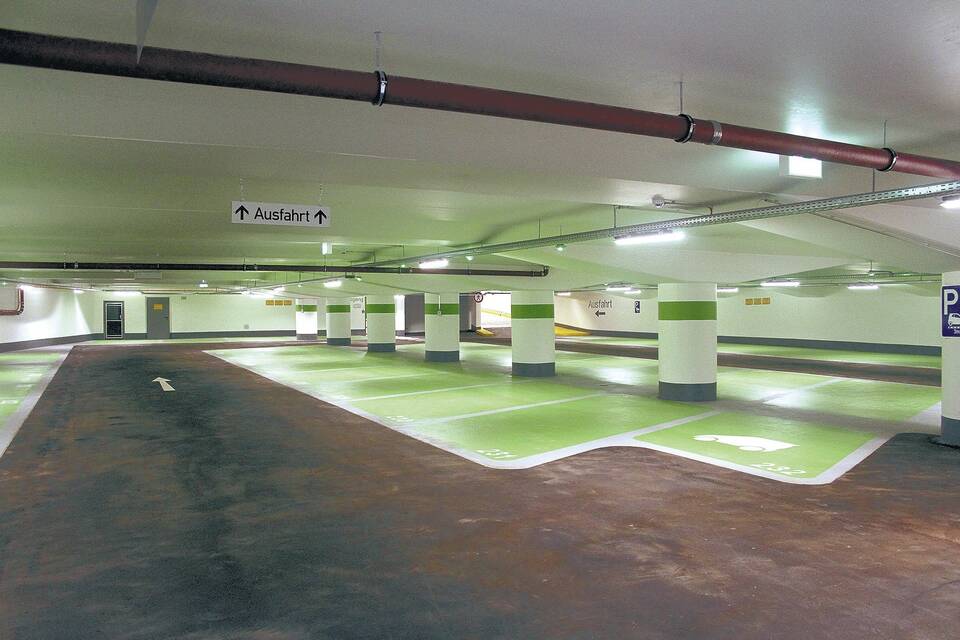 Auch optisch wurde die Garage auf Vordermann gebracht: Während die erste Ebene in strahlendem Blau glänzt, leuchtet die untere Ebene in einem hellen Grün. Gestrichen wurde die ganze Garage. Neu ist wie eingangs erwähnt das Parkleitsystem; das Licht für Frauenparkplätze ist übrigens lilafarben.