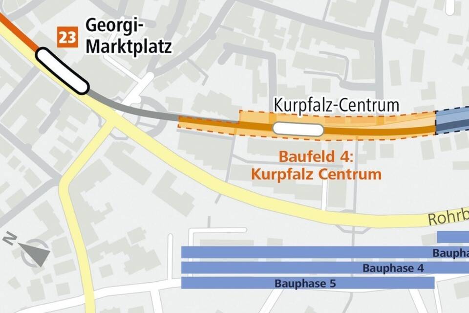 > Bauphase 3 ist für Februar 2021 terminiert. Der Gleisbau im Baufeld 1 soll zu diesem Zeitpunkt abgeschlossen sein. Die Leitungsarbeiten ziehen in das Baufeld 4 weiter. Ab diesem Zeitpunkt kann auch die Haltestelle Kurpfalz-Centrum nicht mehr angefahren werden. Endhaltestelle der Linie 23 ist dann bis zum Ende der Baumaßnahme der Georgi-Marktplatz. Die Gleiserneuerungsarbeiten rücken ins Baufeld 2 weiter. Außerdem wird mit dem barrierefreien Ausbau der Haltestelle Moltkestraße begonnen.