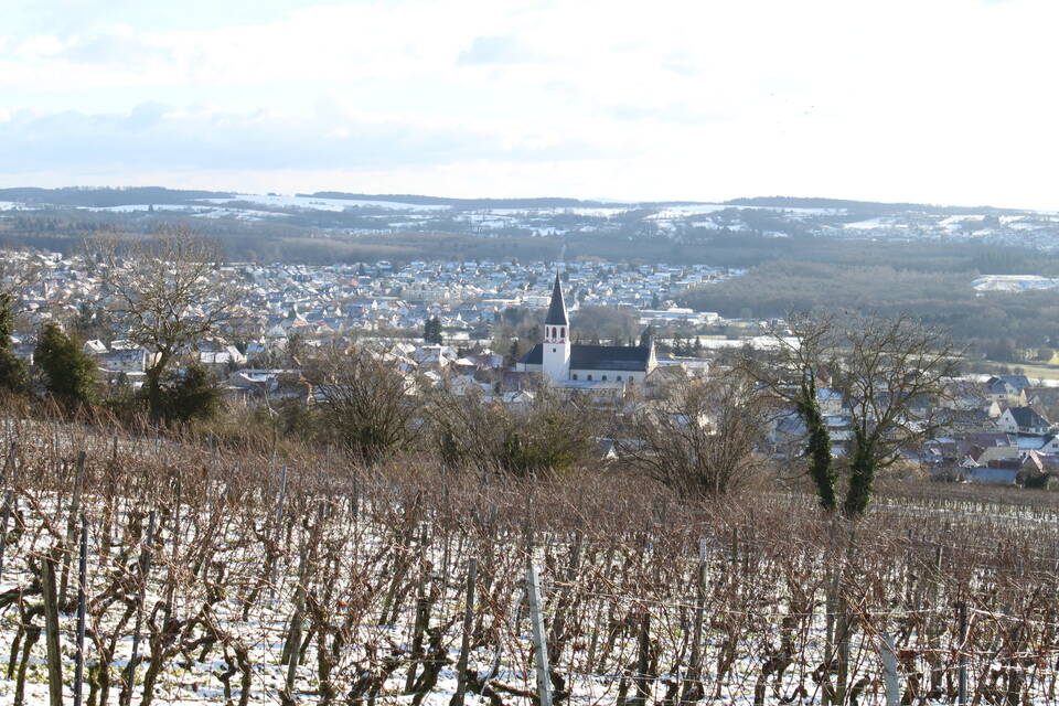 Idyllischer Weinort am Fuße des Letzenbergs: die Gemeinde Malsch mit ihrer Kirche St. Juliana im Winterkleid (im Hintergrund ist Rettigheim sichtbar). Archiv-Foto: Kloé