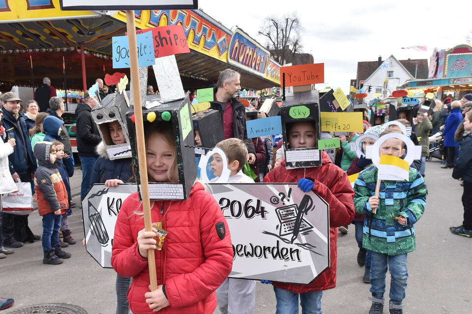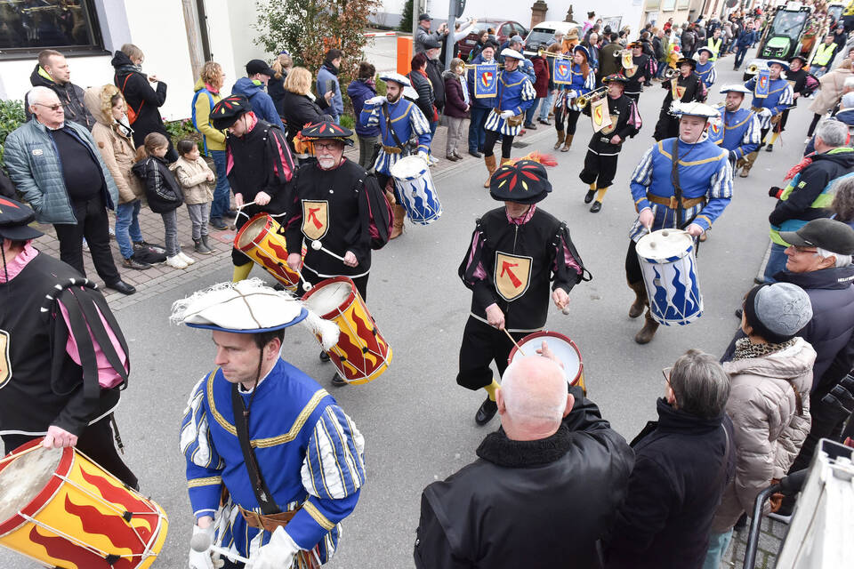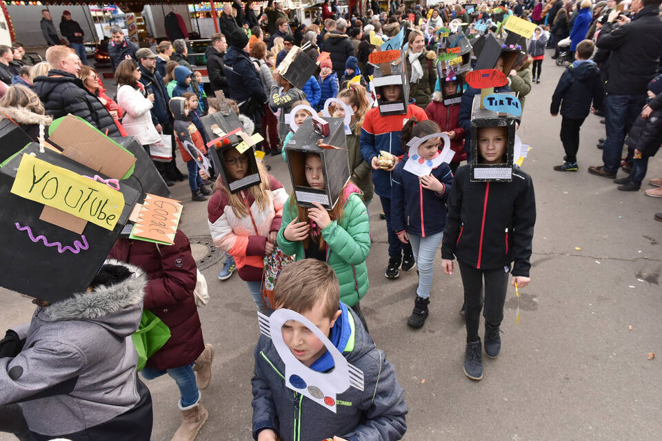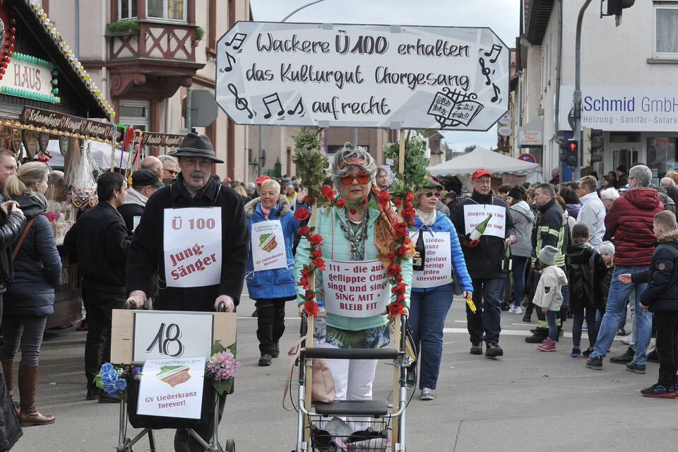 Dass bis dahin die jetzigen Festzug-Teilnehmer deutlich älter sein werden, thematisierte unter anderem der Push-Verein, der seinem Festwagen nach zu urteilen bis dahin zum Seniorentreff mutieren könnte. Der Gesangverein Liederkranz hofft dagegen auf viel Durchhaltevermögen bei den "Ü 100-Jungsängern" – ein Motto, das auch auf den Mitgliedermangel aufmerksam machen soll. Eine ähnliche Motivation hatte auch die Jugendfeuerwehr bei der Gestaltung ihres Festwagens: Roboter wurden dort als Zukunft der Brandbekämpfung gezeigt.