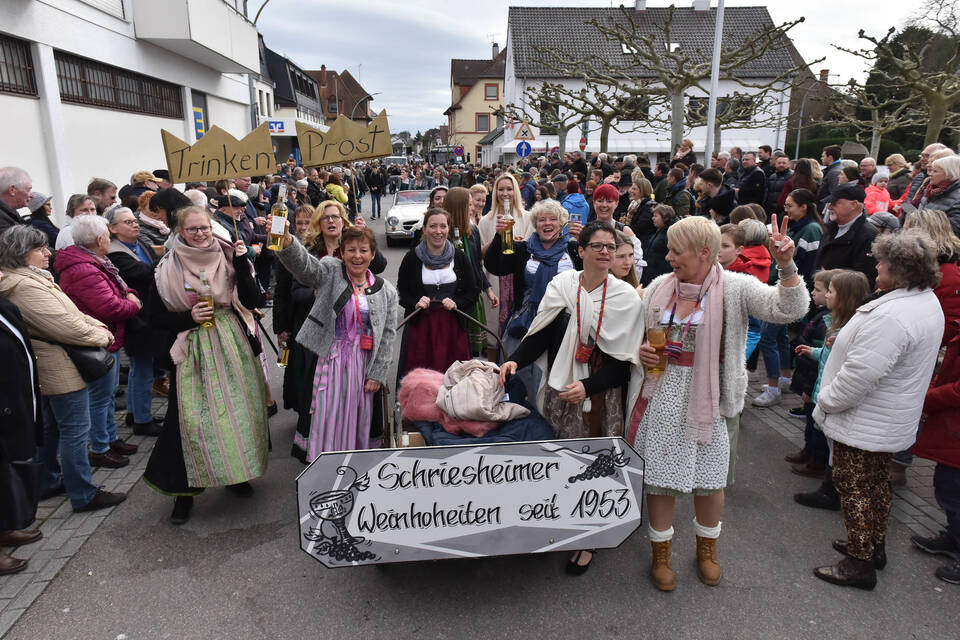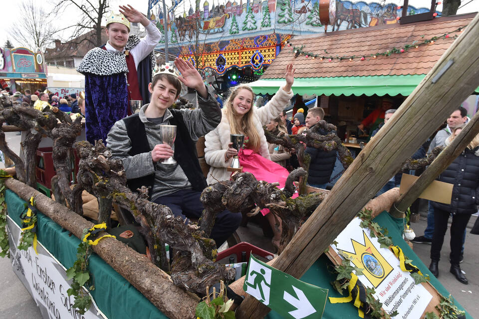 Ob Forellenplage im Kanzelbach bei den Sportanglern, Strom aus Wein bei den Raubrittern oder die erste Außengruppe über den Wolken beim Kindergarten "Wolkenschloss": Der Kreativität waren keine Grenzen gesetzt. Und so kam es, dass die Weinhoheiten Sofia Hartmann, Fabienne Röger und Lena Meyer im Jahr 2064 Konkurrenz bekamen – durch Johannes Schwegele, von der Jagdhornbläsergruppe zum ersten Schriesheimer Weinkönig gekrönt.