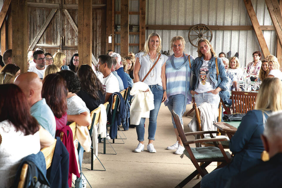 Hölzel stellte die Sommermode vor, die mit weiten Schnitten und hellen Farben für jede etwas zu bieten hat. Die Präsentation übernahmen die Models Kerstin, Susanne und Alexandra. Nach zwei Runden Wein und Mode wurden Schlemmerplatten von "Hertel’s Schlemmerland" aufgefahren. Spaß hatten die vier Freundinnen Ines, Kerstin, Silke und Steffi an ihrem Tisch. Für sie sei es bereits das zweite Mal, sie hätten schon letztes Jahr an der Veranstaltung teilgenommen. Die Kombination von Modenschau, Weinprobe und "leckerem Essen" in der "tollen Atmosphäre" der alten Tabakscheune gefalle ihnen sehr.