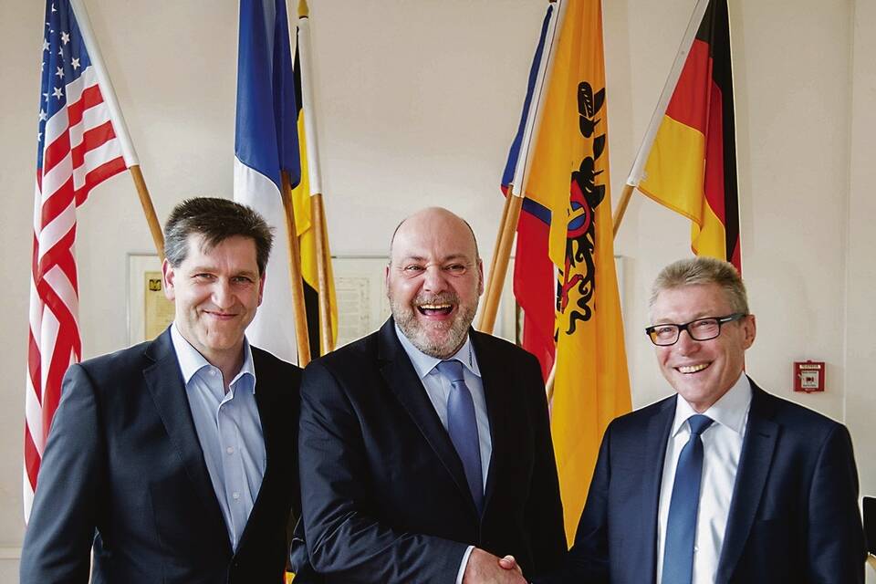 Die Mappe mit dem Vertrag ist geschlossen, die Tinte trocken: Über die Unterzeichnung der Stromkonzession freuen sich (v.l.) Georg Stier, Frank Volk und Gerhard Barth. Foto: Alex