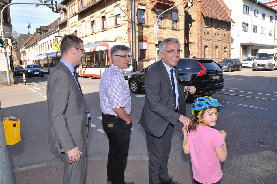 Bürgermeister Manuel Just, Verkehrsingenieur Gerald Teufel und Landrat Stefan Dallinger (v. li.) samt junger Passantin beim Vor-Ort-Termin an der Kreuzung B3/Breitgasse/Riedweg. Foto: Dorn