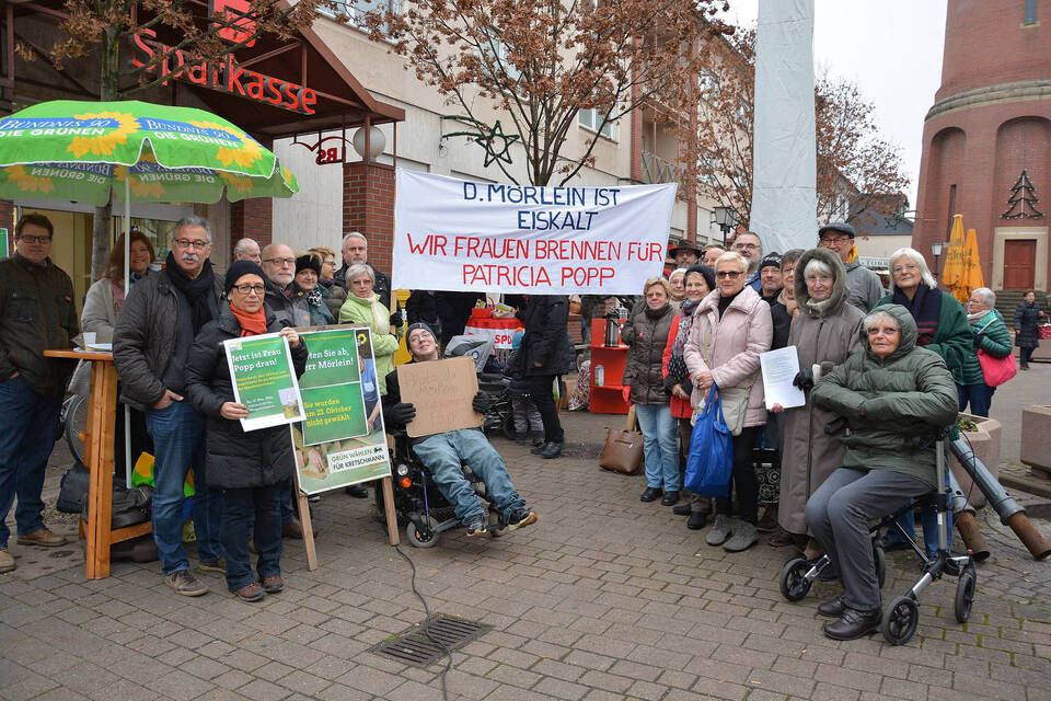 Die Solidaritätskundgebung war eine Gemeinschaftsaktion von SPD und Grünen. Patricia Popp selbst nahm daran nicht teil. Sie war am 23. Oktober im ersten Wahlgang mit deutlicher Mehrheit zur Bürgermeisterin gewählt worden. Aufgrund einer Klage eines Bürgers beim Verwaltungsgericht in Karlsruhe konnte die Wahl noch nicht für rechtsgültig erklärt werden. Der Wähler beklagt, dass sich nach seinem Dafürhalten ein Popp-Plakat zu nah an einem Wahllokal befand. Das Kommunalrechtsamt hatte seinen Einspruch bereits zurückgewiesen. Jetzt wartet man auf die gerichtliche Entscheidung. Trotz laufender Klage könnte Patricia Popp am 1. Januar als Amtsverweserin eingesetzt werden und mit ihrer Arbeit beginnen, sofern der noch amtierende Bürgermeister Mörlein auf die Fortführung der Amtsgeschäfte verzichten würde. Das tut er aber nicht und beruft sich auf die Gemeindeordnung.