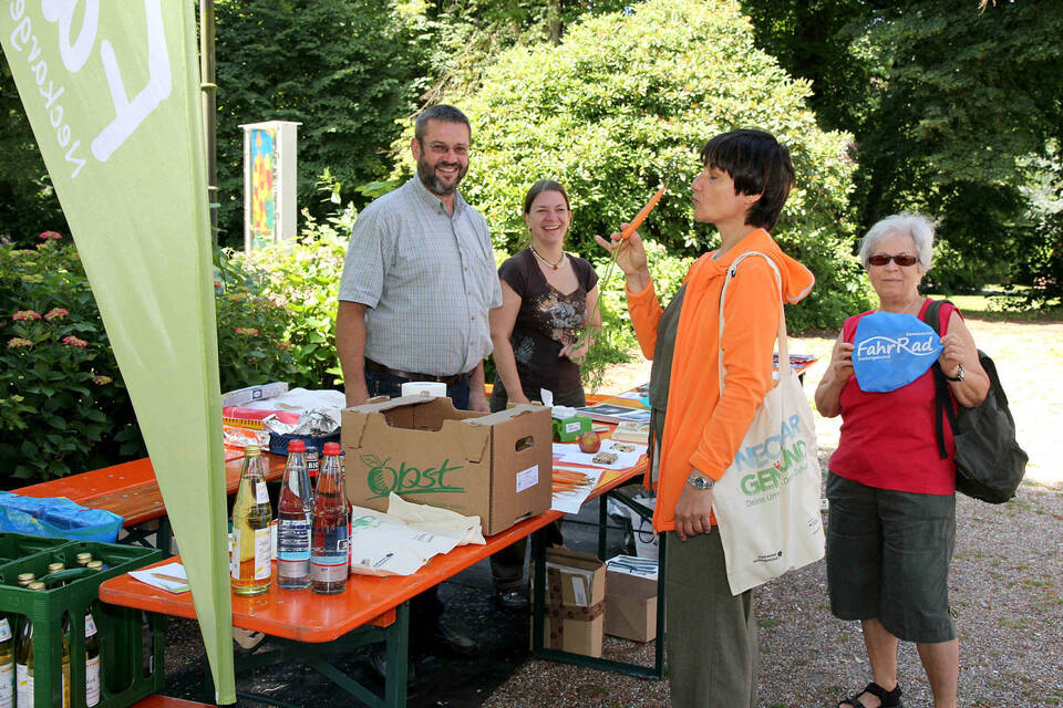 In seiner Ansprache hatte Volk auch auf das "Klimafreundliche Picknick im Menzerpark" der Radoffensive Neckargemünd/Bammental hingewiesen. Hier traf man auf die städtische Klimaschutzbeauftragte Nicola Lender, die gemeinsam mit Walter Gilbert vom Klimaschutzbeirat Rede und Antwort stand. Man konnte mit beiden aber nicht nur reden, man konnte sich auch stärken, mit Getränken, Äpfeln, Möhren und Müsliriegeln. Okay, so richtig opulent ging es nicht zu im Menzerpark. Aber interessante Gespräche haben ja auch ihren Reiz.