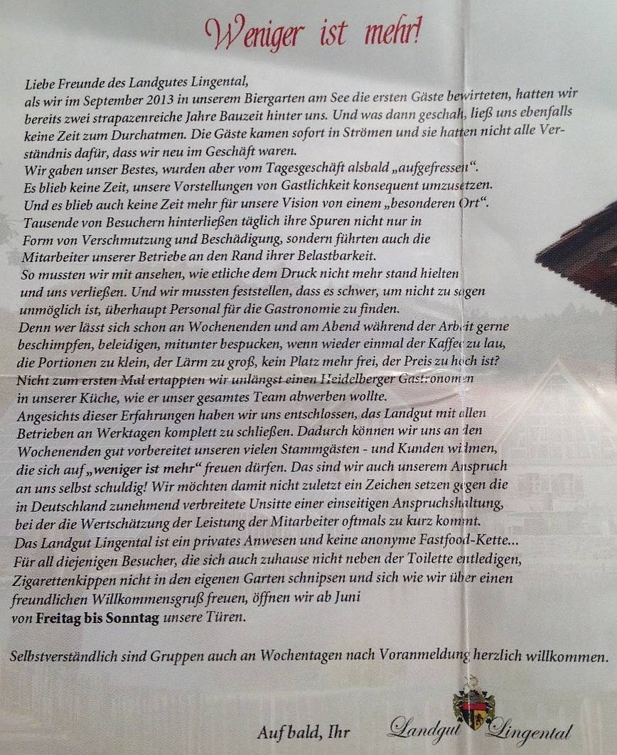 Leimen-Lingental. Die Abrechnung kommt nach dem Kaffee. Eine Postkarte mit Bildchen vom eigenen Haus und einer Überschrift in geschwungenen roten Buchstaben: "Weniger ist mehr!" Darunter gehen die Verantwortlichen vom Landgut Lingental mit den eigenen Gästen hart ins Gericht. Von "Verschmutzung und Beschädigung" ist da die Rede, von Mitarbeitern, die beleidigt oder bespuckt werden, von Kunden, die Zigarettenkippen in den Garten schnipsen.