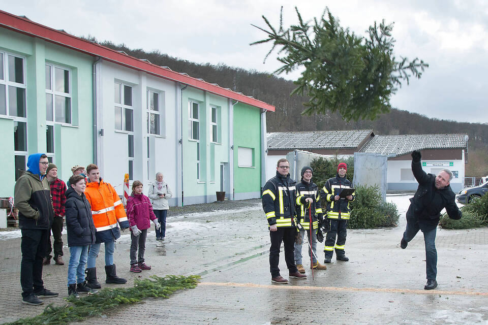 Große Gaudi: Beim Tannenbaum-Weitwurf vor der Lobbachhalle versuchte auch Bürgermeister Maik Brandt sein Glück. Foto: Alex
