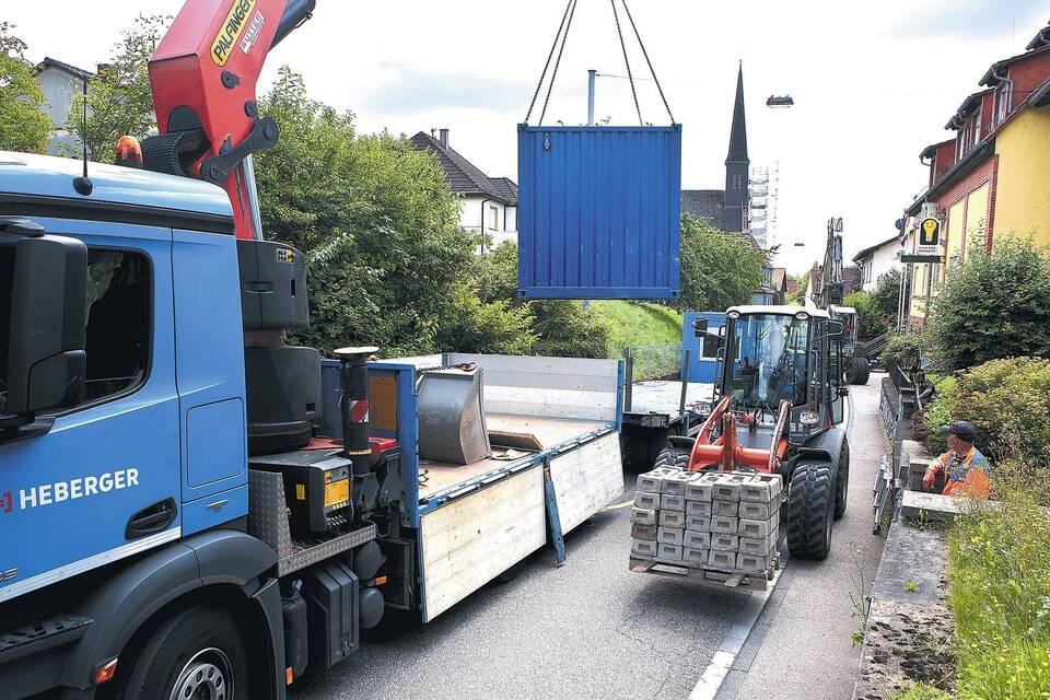 Schweres Baugerät und Container wurden gestern in die Gauangellocher Hauptstraße gebracht. Foto: Alex