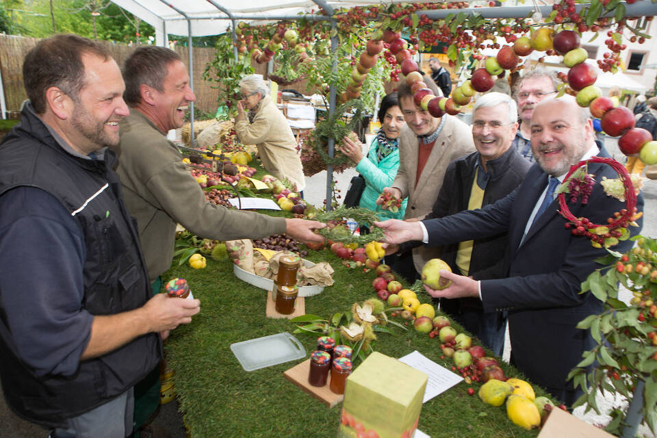 Auf einem Rundgang gab es vieles zu entdecken: Apfelbratwurst, Apfelsuppe mit Meerrettich, Wildschweinburger mit Birne, Flammkuchen mit Streuobst oder auch Streuobstkuchen, Apfel- und Apfelweinbrot im Holzofen gebacken, Gelees, Konfitüren, Apfel-Salz, Streuobst-Trüffel, Imkerei-Produkte und Streuobst-Getränke mit und ohne Alkohol sowie Edeldestillate.