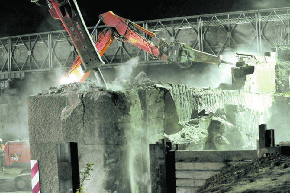 Eppelheim/Heidelberg. Die Erde zitterte, lautes Grollen erfüllte die Luft, riesige Betonbrocken donnerten zu Boden. Als am Freitag gegen 22 Uhr die Autobahn in beide Richtungen gesperrt war, rückten tonnenschwere Bagger mit gigantischen Meißeln an, um die Überbleibsel der beiden Brücken zwischen Eppelheim und dem Heidelberger Stadtteil Pfaffengrund abzureißen. (Hier geht es zur Fotostrecke)
