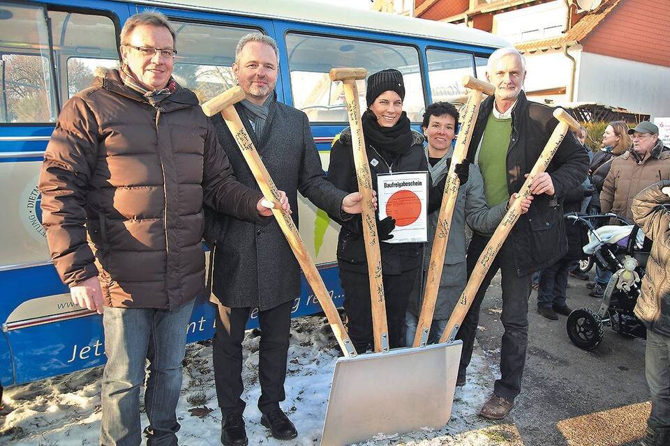 Bauamtsleiter Uwe Schwarz (v.l.), Bürgermeister Maik Brandt, Katrin Tönshoff von der Hopp-Stiftung, Sandra Zettel und Architekt Norbert Schäfer griffen zu einem ungewöhnlichen Spaten.