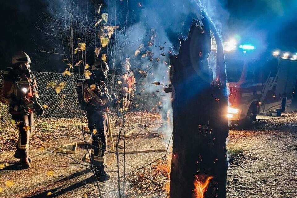 Die Wehrleute löschten das Feuer, zerkleinerten den Stumpf mit Axt und Kettensäge, um noch versteckte Glutnester abzulöschen. Die Polizei wurde hinzugezogen und nahm Hinweise auf eine mögliche Brandursache auf.